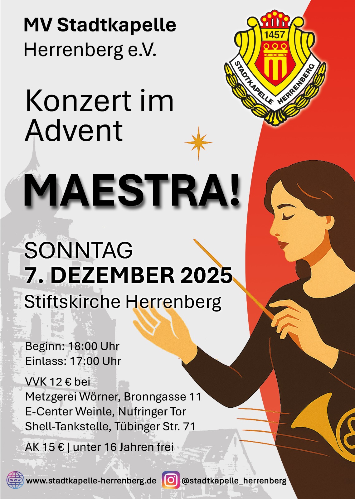 Der Musikverein Stadtkapelle Herrenberg e.V. lädt am zweiten Advent zu einem besonderen musikalischen Abend in der Stiftskirche ein. Unter dem Motto “Maestra!” stehen ausschließlich Werke von Komponistinnen auf dem Programm. Damit rückt das diesjährige “Konzert im Advent” gezielt weibliche Musikschaffende in den Fokus, die sowohl in der klassischen Musik als auch in der sinfonischen Blasmusik nach wie vor unterrepräsentiert sind.