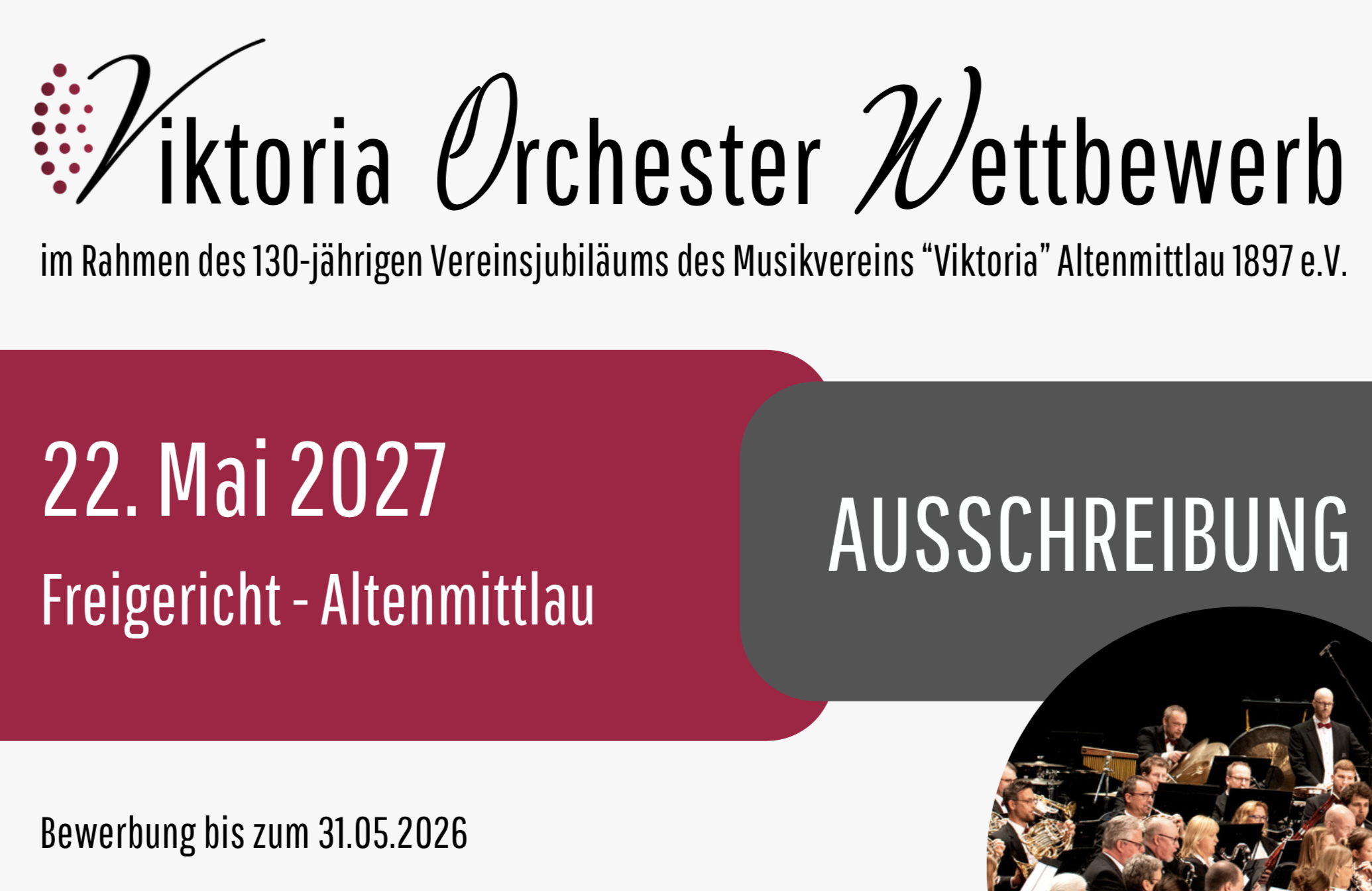 Der Musikverein „Viktoria“ Altenmittlau lädt im Jubiläumsjahr 2027 zu einem musikalischen Ereignis der besonderen Art ein: am Samstag, 22.Mai 2027, findet in Altenmittlau im Rahmen des Jubiläumswochenendes (21.-24.Mai) erstmals der „Viktoria Orchester Wettbewerb“ (VOW) für sinfonische Blasorchester statt. Zum 130-jährigen Bestehen des Vereins entsteht damit ein neues Forum für sinfonische Blasmusik.  Interessierte Orchester sind jetzt herzlich eingeladen, sich anzumelden!